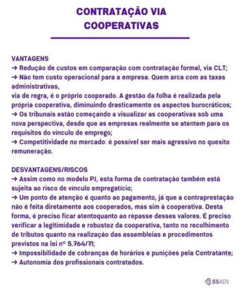 Outra forma que guarda semelhanças à contratação PJ é por meio de cooperativas, um modelo que já é utilizado por outras categorias profissionais. Nesse caso, o profissional não precisa constituir um CNPJ nem ter os encargos relativos: a contratação é feita por intermédio de uma cooperativa à qual o prestador dos serviços se associa como pessoa física. Os membros da cooperativa não têm subordinação entre si, são autônomos e não têm horário de trabalho. Neste modelo, a empresa contrata diretamente a cooperativa, e é esta quem realiza os trâmites de pagamento.;